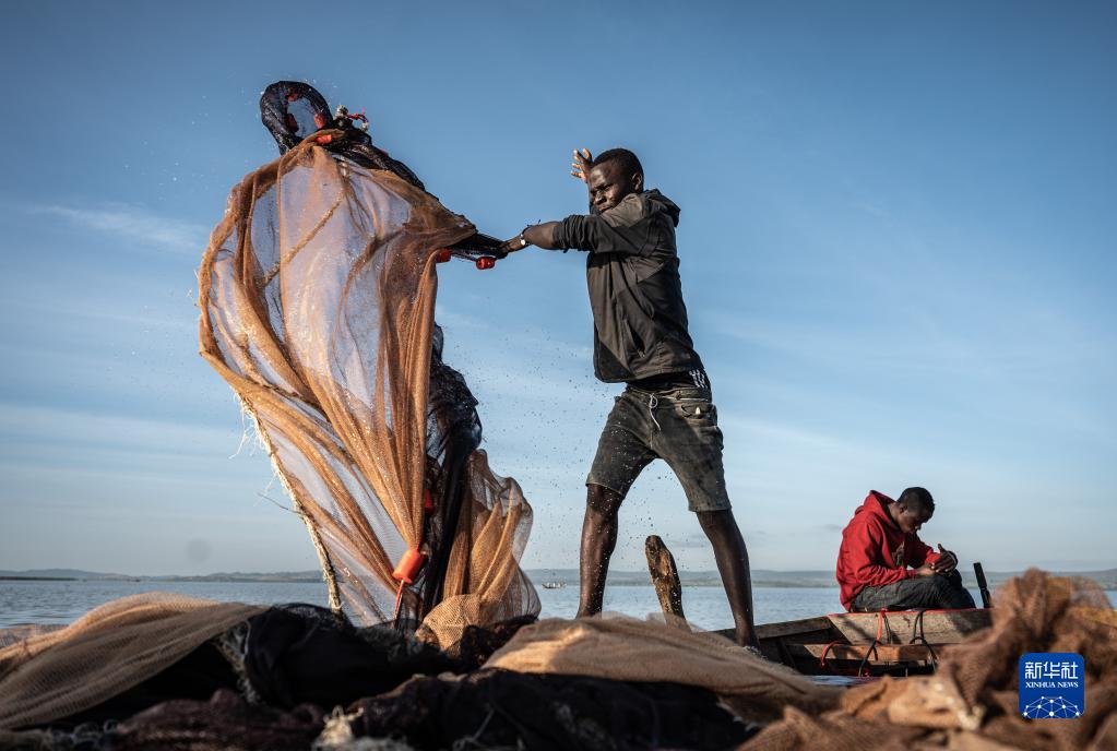 6月12日,在坦桑尼亚姆万扎省,渔民在维多利亚湖中捕鱼。