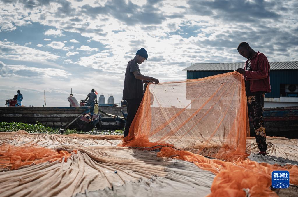 6月10日,坦桑尼亚姆万扎省维多利亚湖畔的渔民整理渔网。