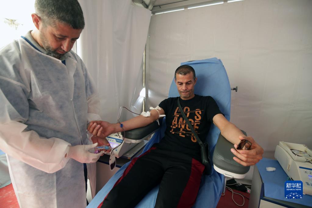 6月14日,志愿者在阿尔及利亚阿尔及尔一处献血点献血。
