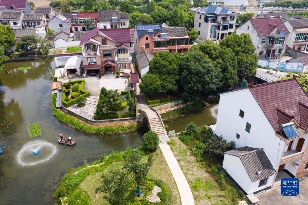 6月15日,空中俯瞰嘉兴市秀洲区新塍镇康和桥村(无人机照片)。新塍镇康和桥村水系发达,河网密布,近年来,该村先后获得省级美丽乡村特色精品村、省级AAA景区村庄等荣誉称号。2022年以来,康和桥村对知青宿舍、食堂、钮扣厂、大礼堂及周边环境进行修复提升,并建有知青学堂、纽扣记忆馆、广电记忆馆、乡间艺术馆、乡间休闲园等节点,打造江南水乡风貌融合红色文化元素的知青文化村。
