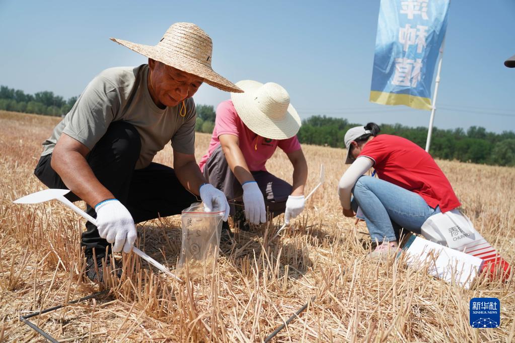 6月15日,在2023年北京市小麦机收减损技能大比武现场,工作人员检查参赛选手的作业质量。