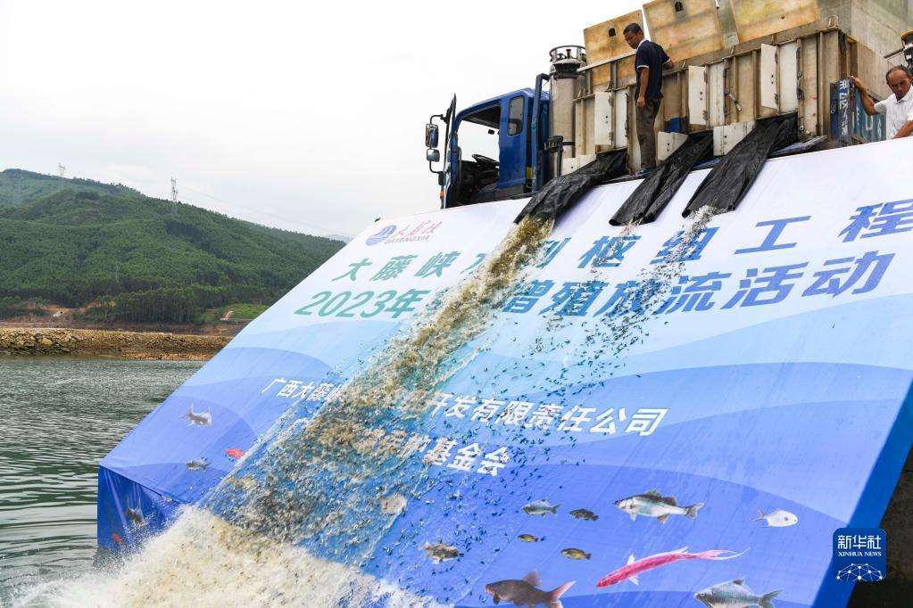 当日,位于广西桂平市的大藤峡水利枢纽工程举行夏季鱼苗放流活动。