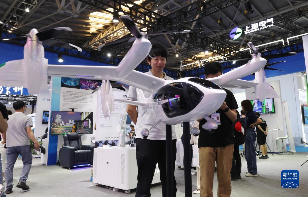 6月15日,参观者在一架纯电动载人垂直起降飞行器模型前驻足观看。