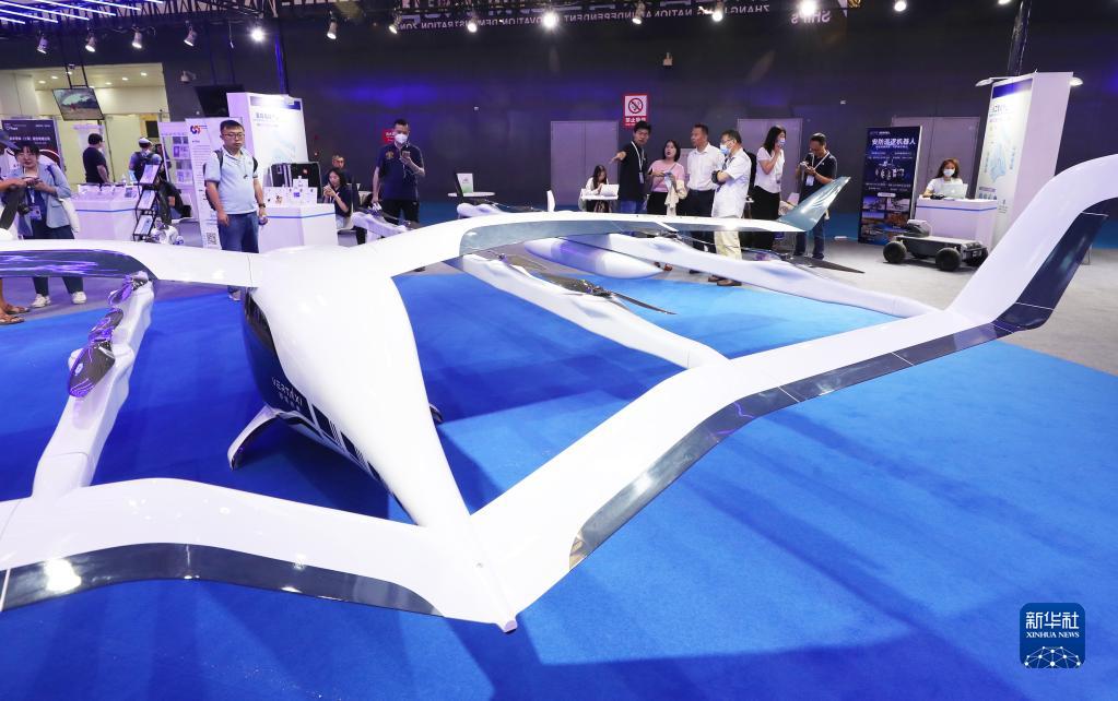 6月15日,参观者在一款电动垂直起降固定翼载人机前交流讨论。