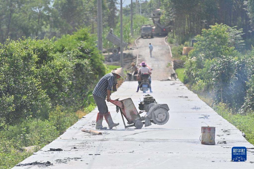 6月15日,在鹿寨县中渡镇石墨村,工人在建设田间道路。