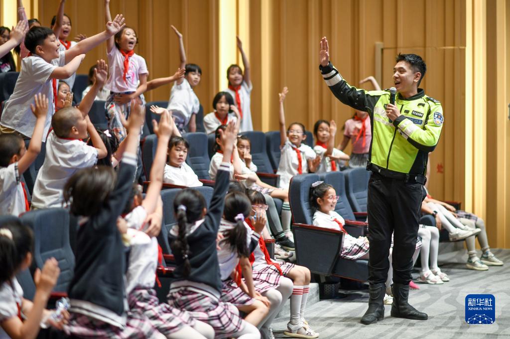 6月15日,在新疆文化馆剧场,乌鲁木齐市第十四小学的学生在乌鲁木齐市公安局交通警察支队民警的带领下互动抢答,学习交通安全出行知识。