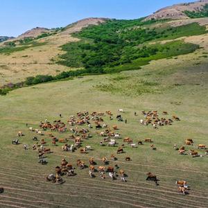 夏日,内蒙古阿鲁科尔沁草原绿意盎然,牛羊在草原上觅食,景色如画。