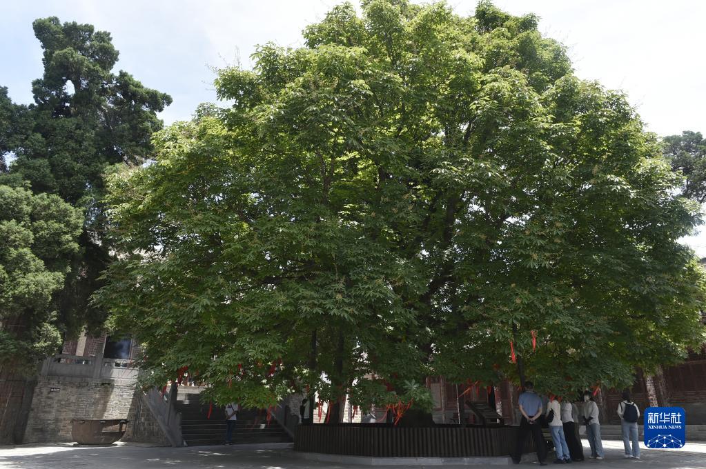 6月15日,游人在王屋山上参观一棵古树。
