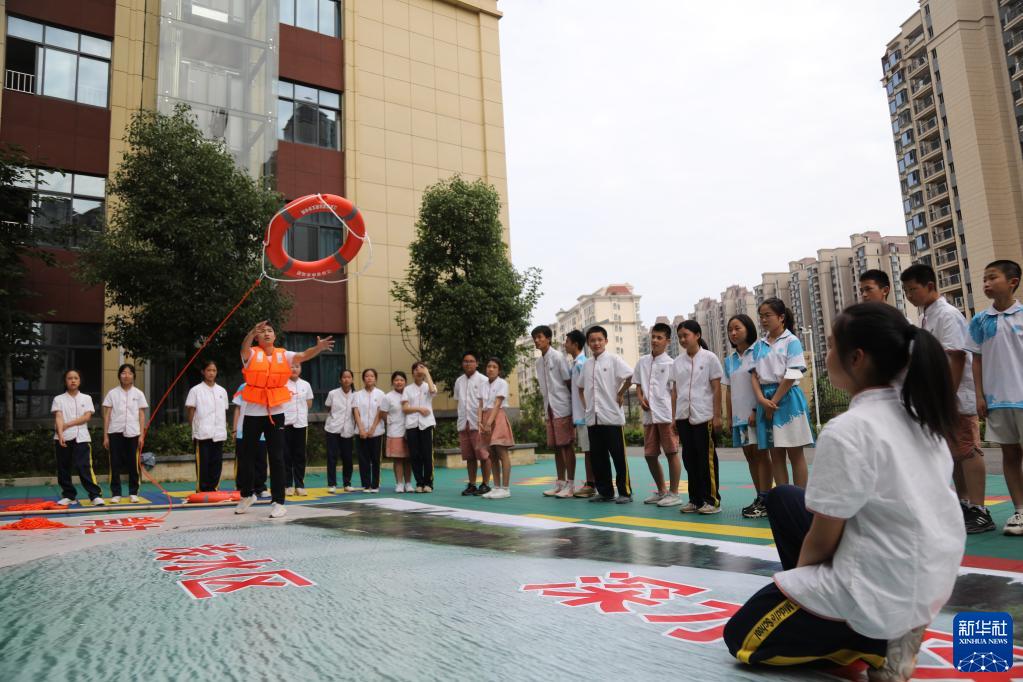 6月15日,在南昌二十八中湾里实验学校,老师在户外指导同学们溺水应急救援。