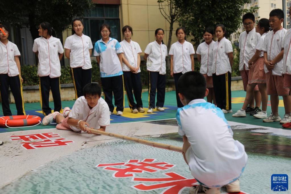 6月15日,在南昌二十八中湾里实验学校,老师在户外指导同学们进行浅水区竹竿救援实操。