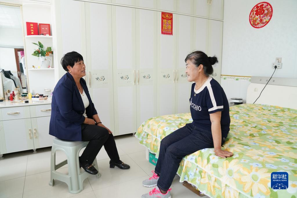 王英侠(左)在西安村一村民家中走访(6月15日摄)。