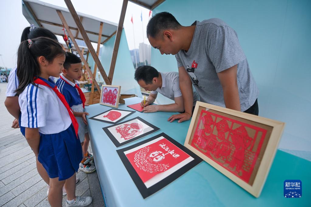 6月16日,学生们在法治游园会上观看制作法治文化为主题的剪纸。