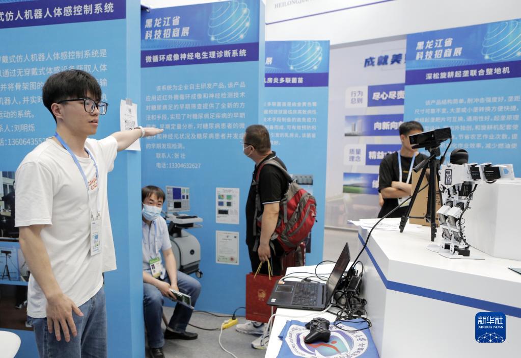 6月16日,参展商通过无穿戴式体感控制系统实时操控机器人执行动作。