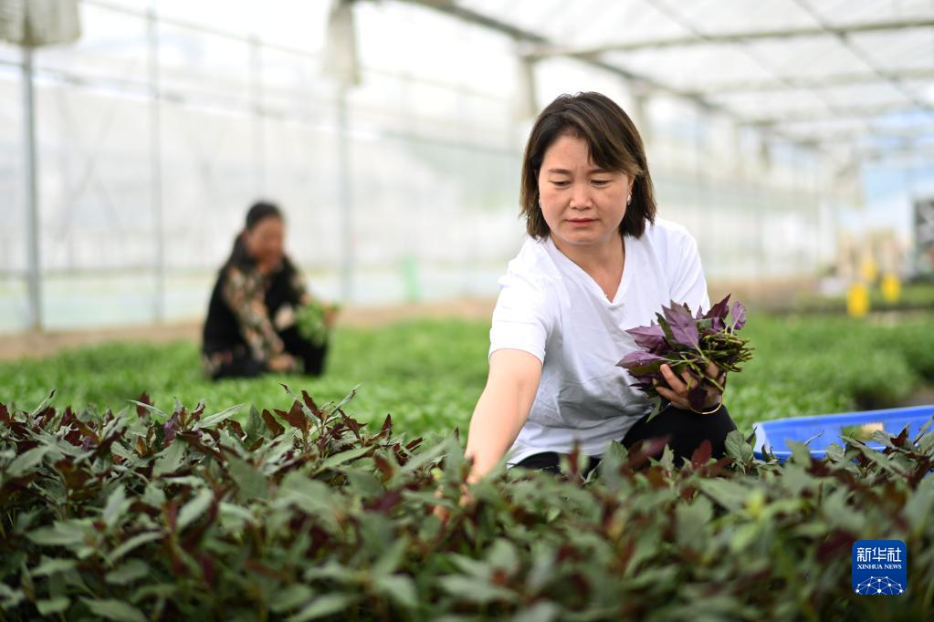 6月16日,村民在贵州省黔东南苗族侗族自治州黄平县旧州镇野菜种植基地采收野菜紫背天葵。