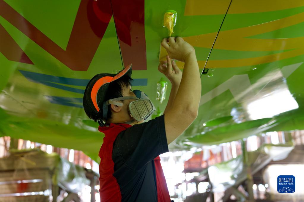 6月15日,海航斯提斯喷漆作业员在恢复机身外部标牌。