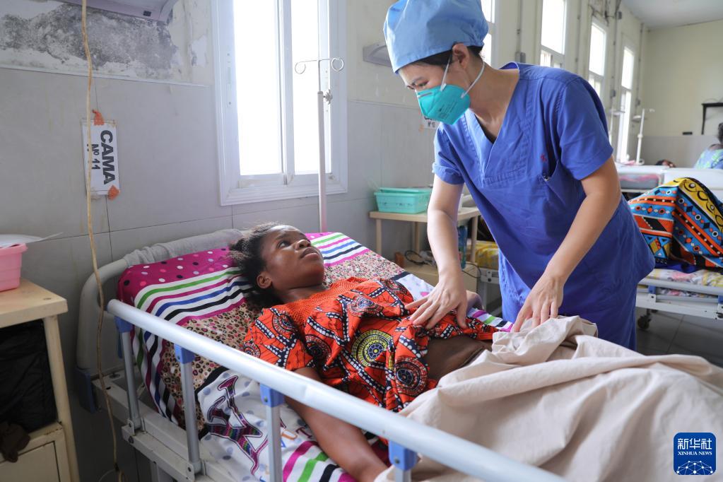 6月14日,在赤道几内亚首都马拉博的马拉博地区医院,中国医疗队妇产科医生王伟伟为产妇检查。
