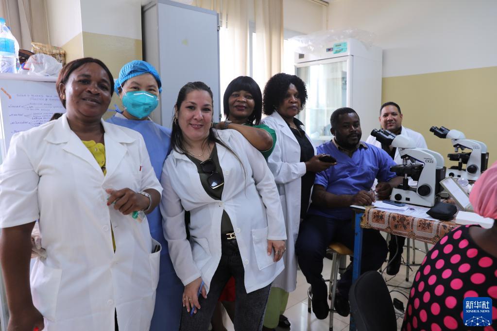 6月14日,在赤道几内亚首都马拉博的马拉博地区医院,中国医疗队检验科医生杨晓仪(左二)与医院同事合影。