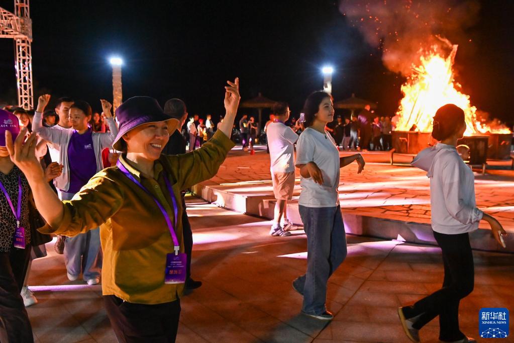 在新疆霍城县图开沙漠,游客和当地居民一起围着篝火跳舞(6月17日摄)。