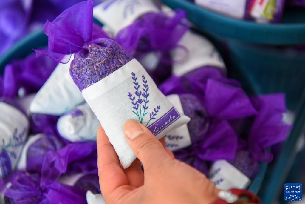 在位于新疆霍城县芦草沟镇四宫村的解忧公主薰衣草农场,游客选购薰衣草产品(6月16日摄)。