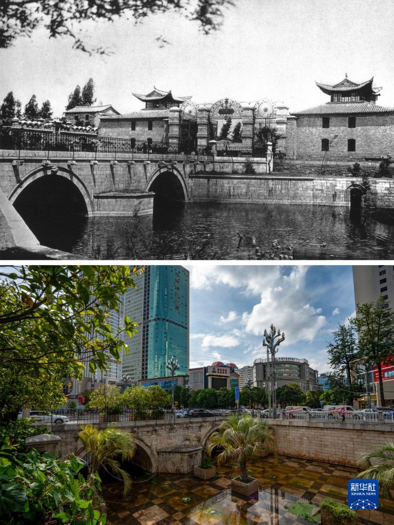 下图为如今的昆明护国桥及周边景色(6月15日摄)。护国桥曾一度因修路被填埋,2001年重见天日后重新修缮。新华社记者江文耀摄