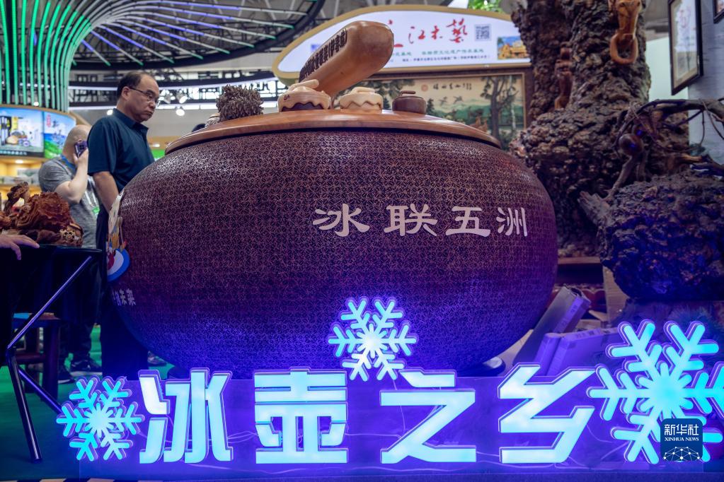 6月16日在伊春展区拍摄的由山核桃切片制成的冰壶。