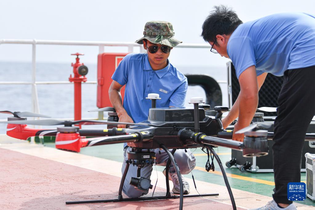 工作人员在“电科1号”综合试验船上调试无人机(6月15日摄)。