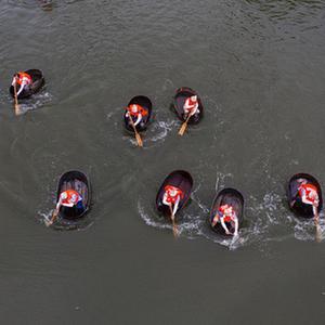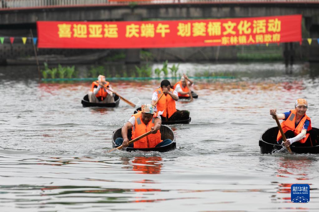当日,浙江省湖州市吴兴区东林镇举办“庆端午 划菱桶”趣味系列活动,来自各村的30多名选手一人一桶在泉益村的河塘里竞相追逐,热闹非凡。活动现场还设有射五毒、做香囊、包粽子、做艾草花束等活动,让百姓和游客在观赏精彩比赛的同时了解特色端午习俗。
