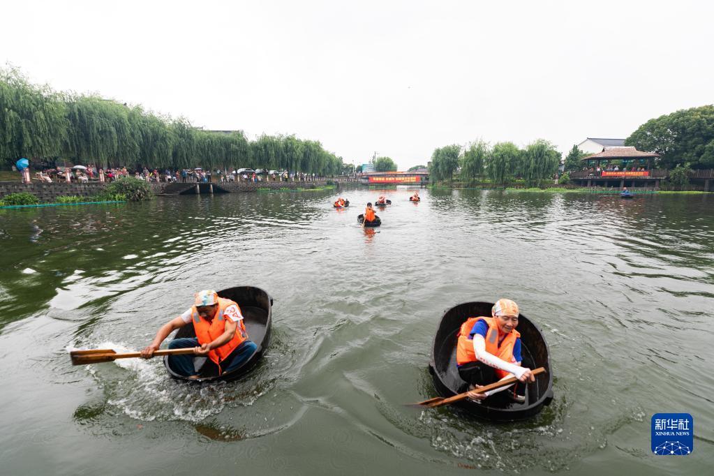 当日,浙江省湖州市吴兴区东林镇举办“庆端午 划菱桶”趣味系列活动,来自各村的30多名选手一人一桶在泉益村的河塘里竞相追逐,热闹非凡。活动现场还设有射五毒、做香囊、包粽子、做艾草花束等活动,让百姓和游客在观赏精彩比赛的同时了解特色端午习俗。