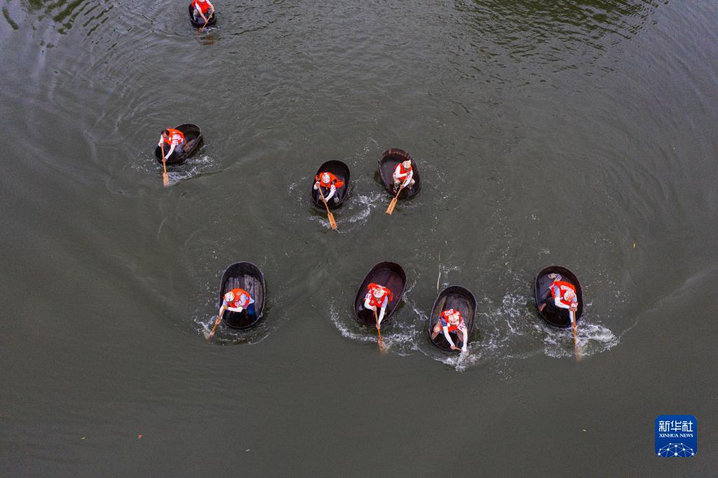 6月17日,村民们划着菱桶在水面上参加比赛(无人机照片)。