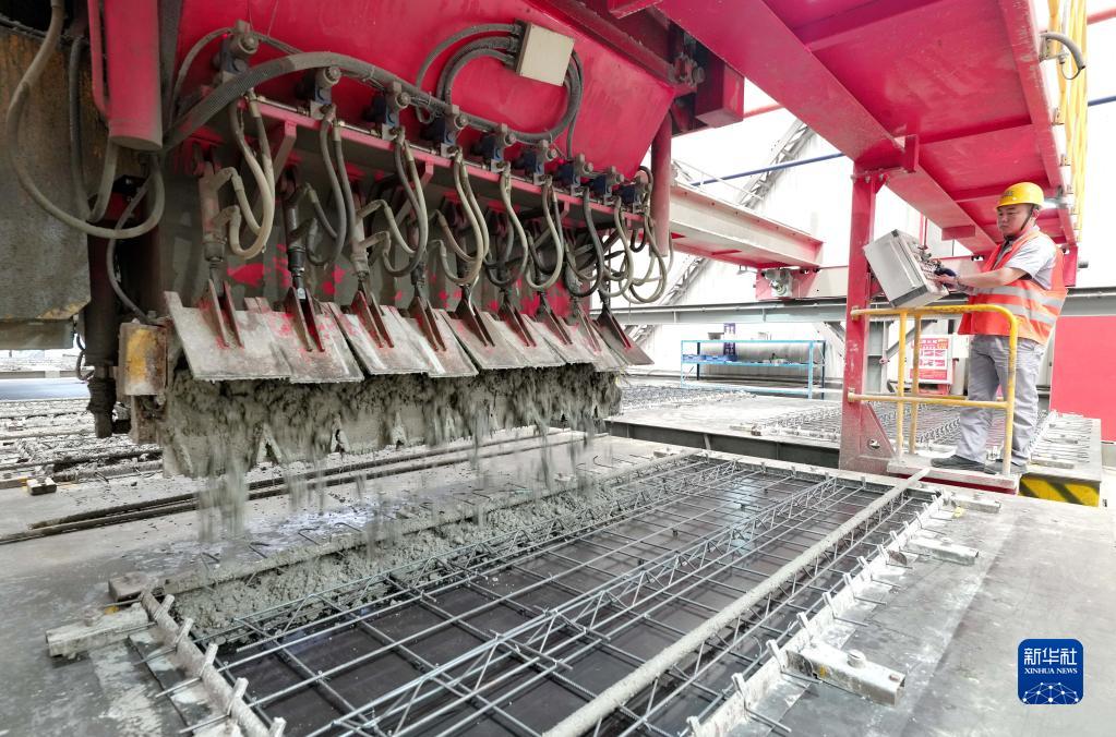 6月17日,工人在秦皇岛市抚宁区一家装配式建筑企业的生产车间操作机械设备浇筑预制钢筋混凝土墙体。