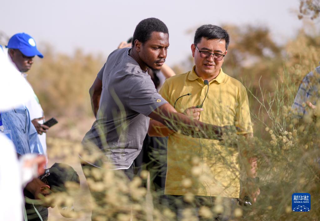 在中科院新疆生态与地理研究所策勒沙漠研究站天然实验区,买尔当(右一)为参加第二届非洲绿色长城建设技术培训班的学员讲解(6月13日摄)。新华社记者 王菲 摄