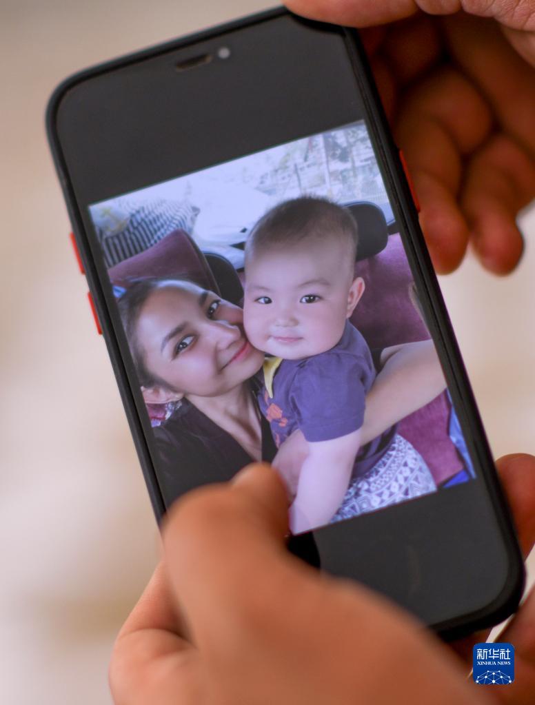 在中科院新疆生态与地理研究所策勒沙漠研究站,买尔当在翻看手机上妻儿的照片(6月13日摄)。新华社记者 王菲 摄