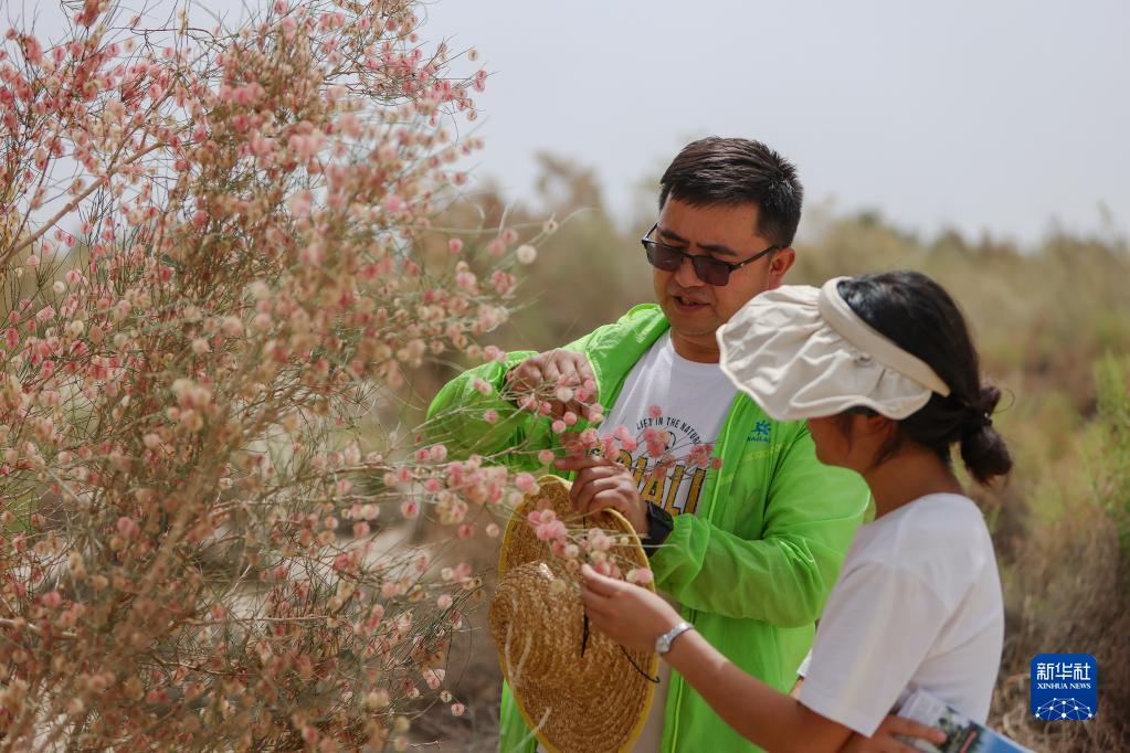 在中科院新疆生态与地理研究所策勒沙漠研究站天然试验区,买尔当和学生查看沙拐枣生长情况(6月12日摄)。新华社记者 郝昭 摄