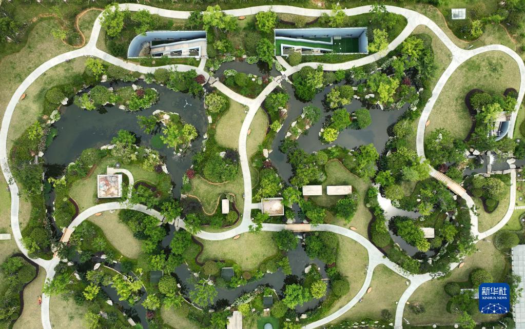 以“地上花园+地下治污”设计理念建设的九江市双溪公园(6月15日摄,无人机照片)。