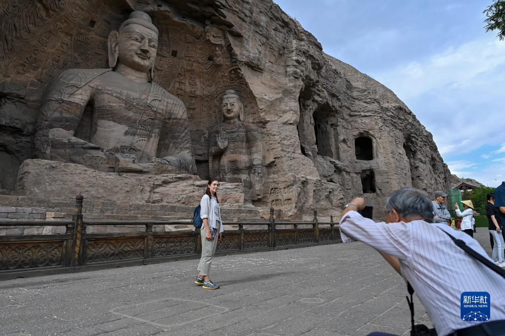 一位外国游客在云冈石窟拍照留念(2023年6月7日摄)。