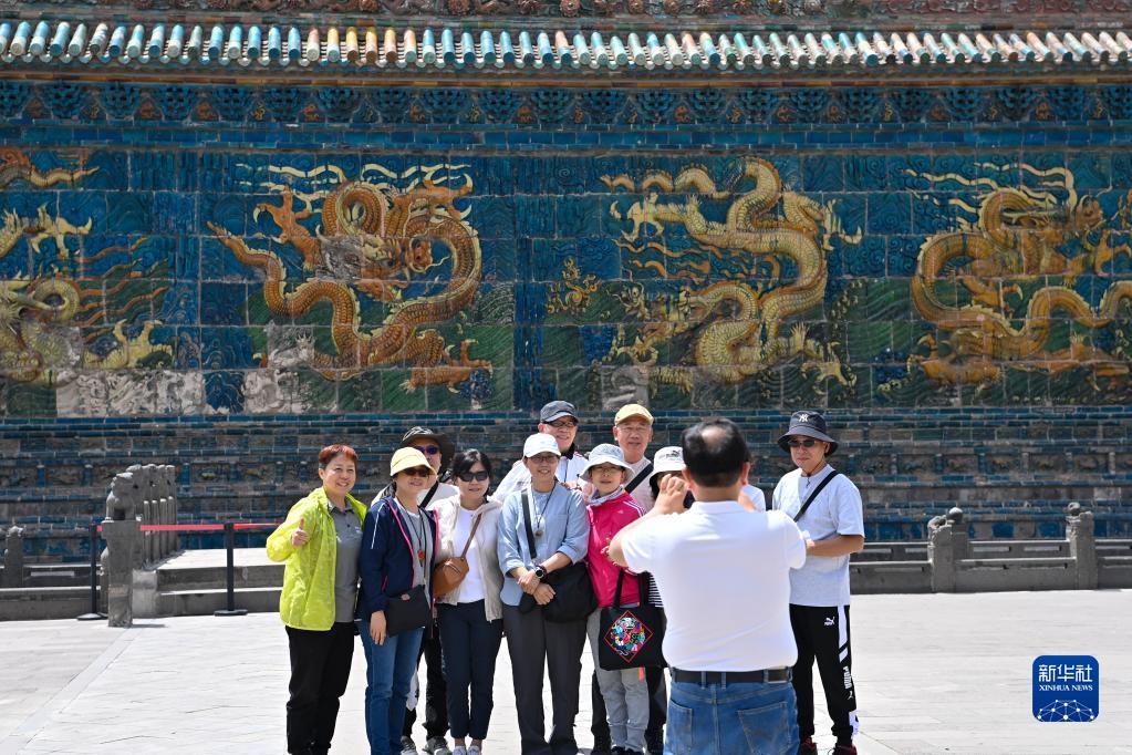 游客在位于大同市平城区的大同九龙壁景区内合影(2023年6月8日摄)。