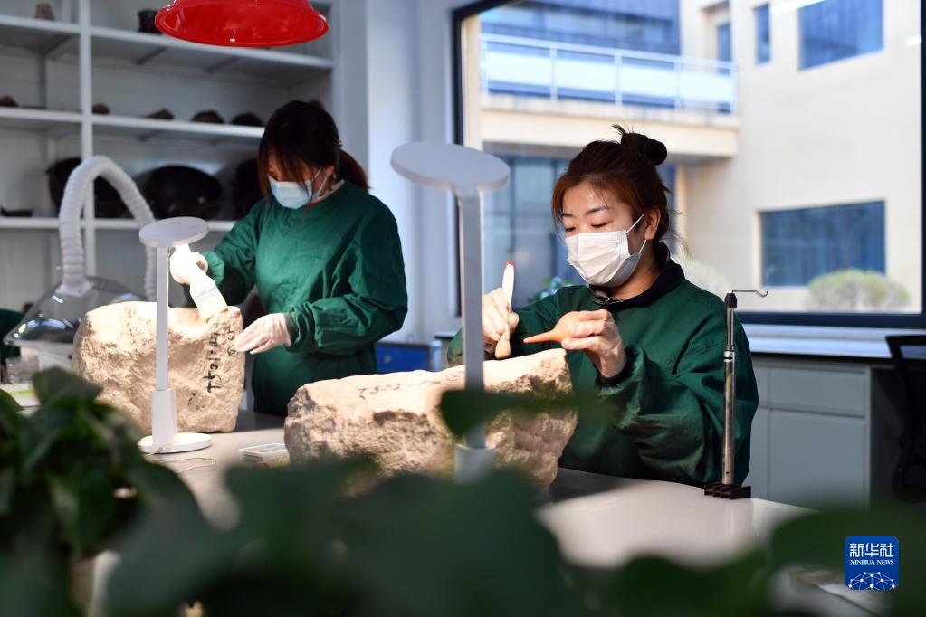 在山西大同云冈石窟研究院可移动文物修复室,工作人员在进行除尘作业(2021年5月8日摄)。