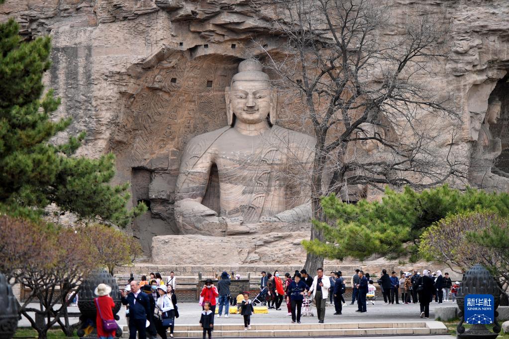 游客在山西大同云冈石窟游览(2021年5月9日摄)。