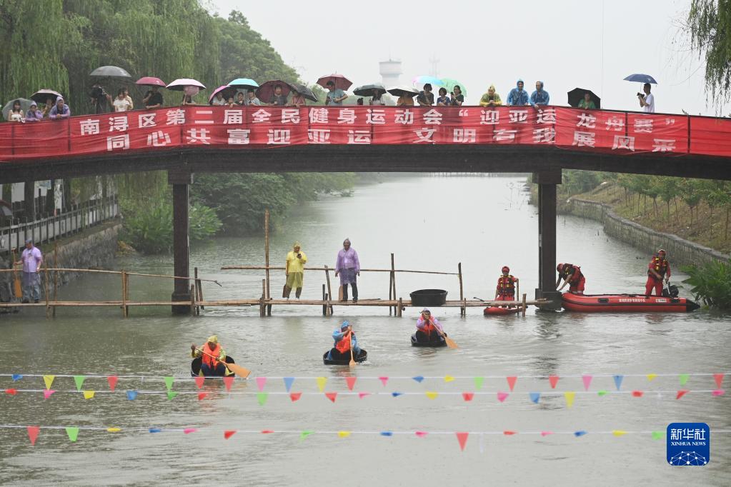 6月18日,农民选手在参加划菱桶比赛。