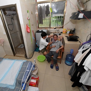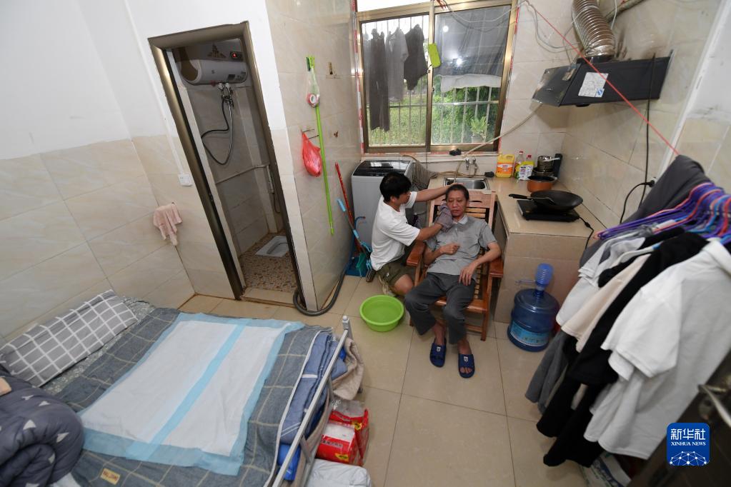 6月17日,在广西南宁,袁东旺在学校附近的出租房里帮父亲洗脸。