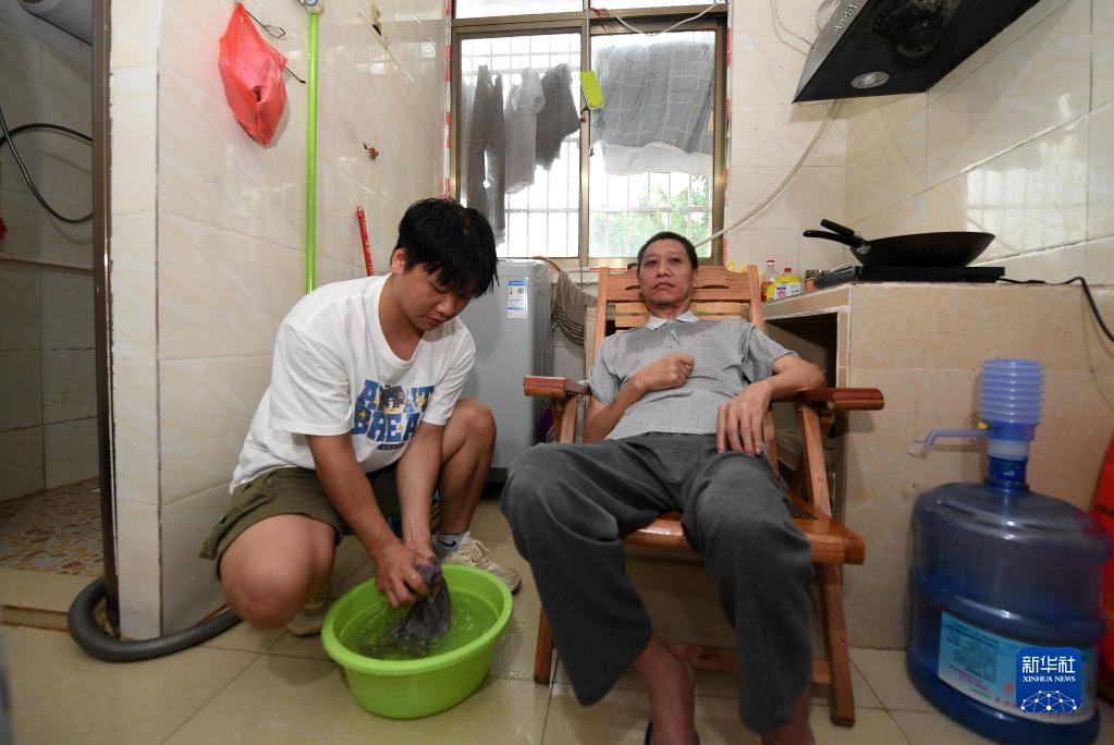 6月17日,在广西南宁,袁东旺在学校附近的出租房里洗毛巾,准备帮父亲洗脸。