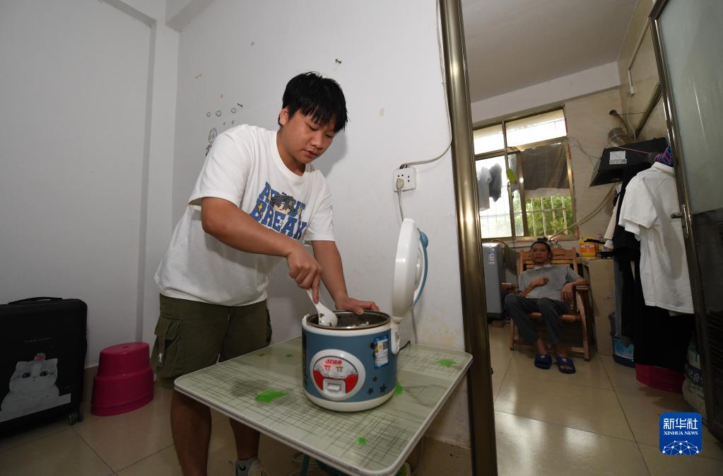 6月17日,在广西南宁,袁东旺在学校附近的出租房里做饭。