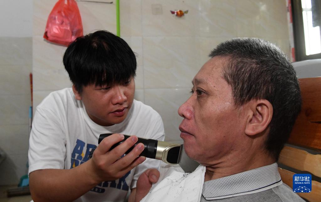 6月17日,在广西南宁,袁东旺在学校附近的出租房里给父亲剃胡子。