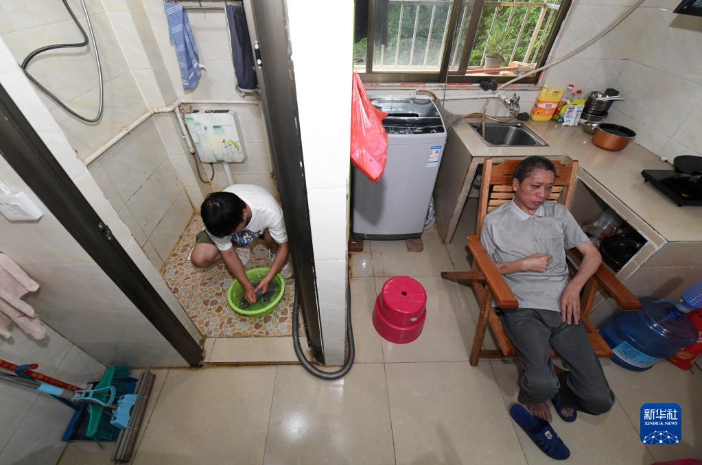 6月17日,在广西南宁,袁东旺在学校附近的出租房里洗毛巾。