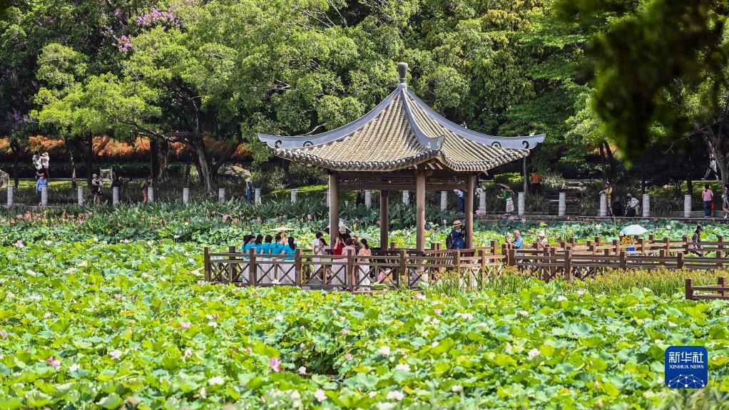 6月18日,人们在南宁市南湖公园荷花亭观赏荷花。