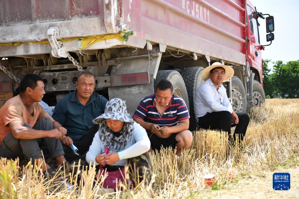 6月8日,薛强(右一)与合作社社员们在收割小麦间隙歇息。