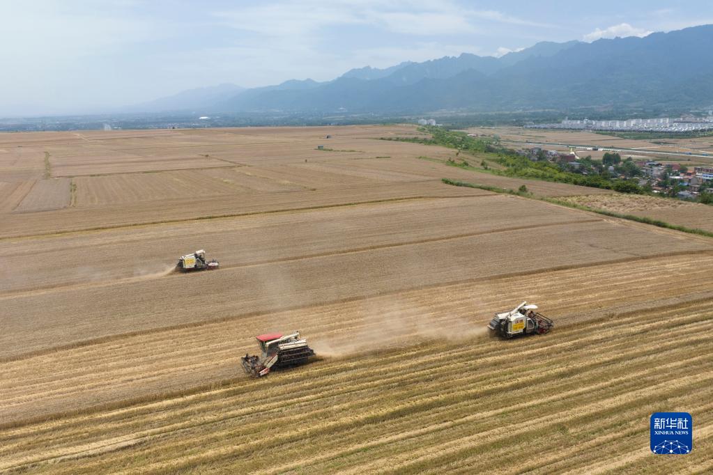 6月8日,长丰农机专业合作社的收割机在西安市长安区神禾塬万亩优质粮食生产基地内抢收小麦。