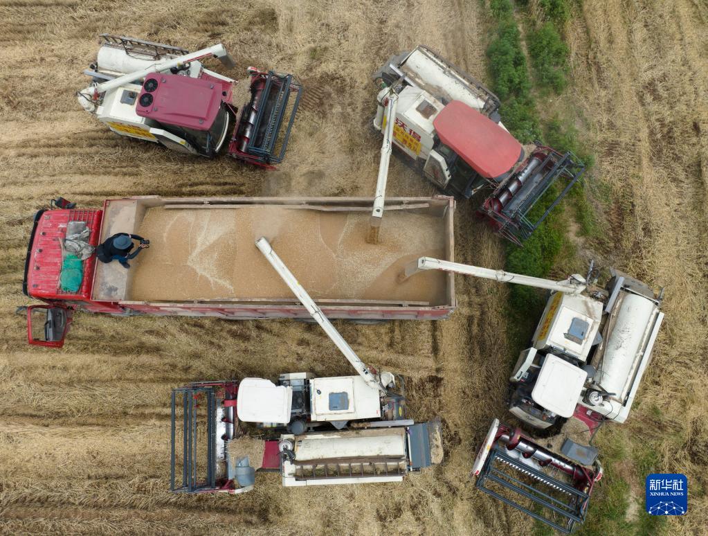 6月8日,长丰农机专业合作社的收割机将收获的小麦装车。