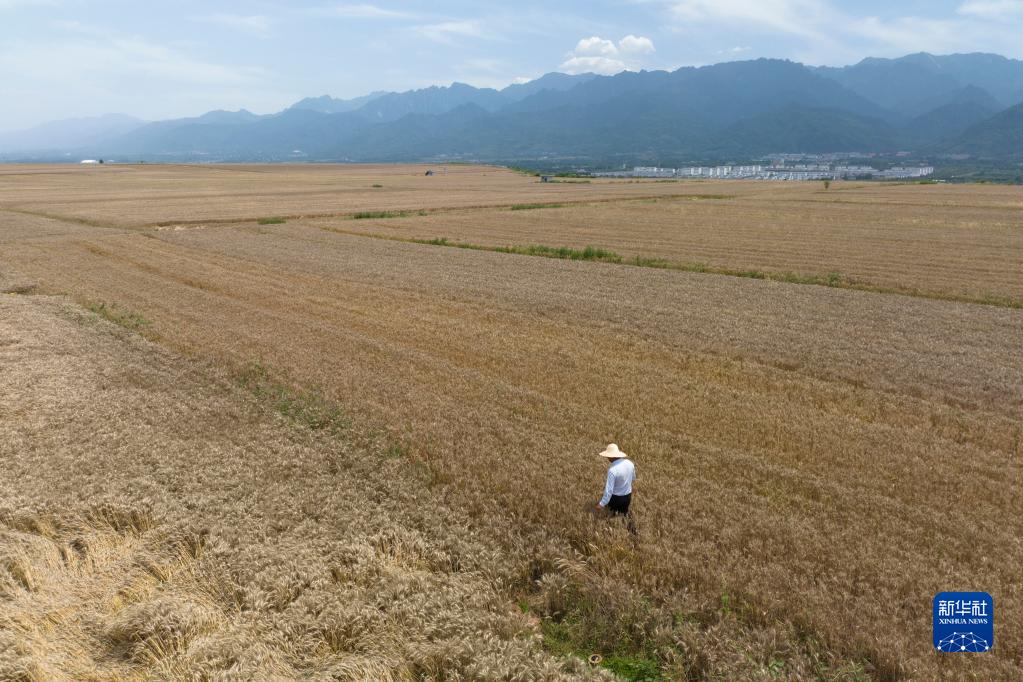 6月8日,薛强边走边查看不同地块内的小麦长势(无人机照片)。