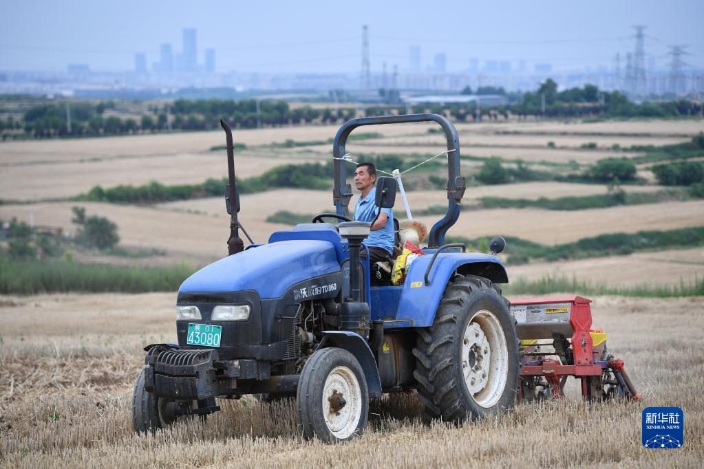 6月16日,长丰农机专业合作社的农机手驾驶拖拉机,在西安市长安区神禾塬万亩优质粮食生产基地播种玉米。